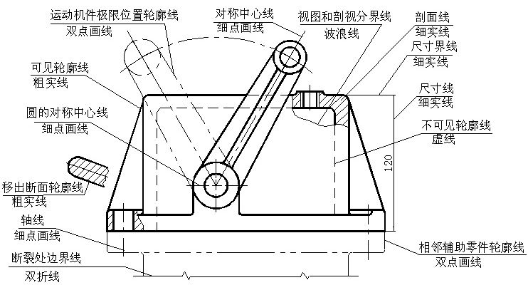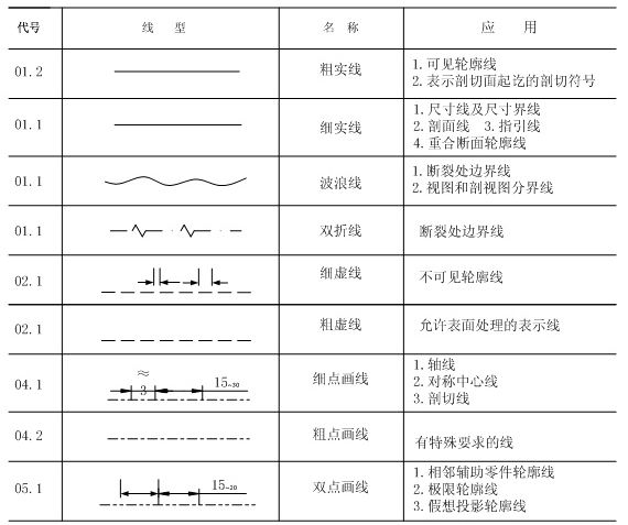 绘制图样时,所采用的各种线型及其应用场合应符合国标(GB/T17450—1998和GB/T 4457.4—2002 )的规定。 图线分粗、细两种。粗线的宽度b在0.5~2 mm,细线约为b/2。 图线的宽度推荐为:0.18、0.25、0.35、0.5、0.7、1、1.4、2 mm 。 同一图样中,同类图线的宽度应基本一致。 图线的画法参照下表