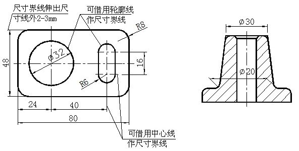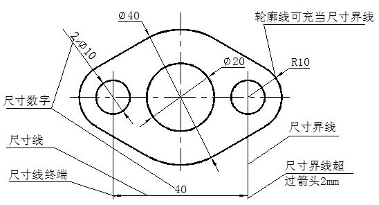1、尺寸界线 表示所注尺寸的起始和终止位置,用细实线绘制。它由图形的轮廓线、轴线或对称中心线处引出。也可利用轮廓线、轴线或对称中心线本身作尺寸界线。尺寸界线一般应与尺寸线垂直;尺寸界线超出尺寸线 2 mm左右。