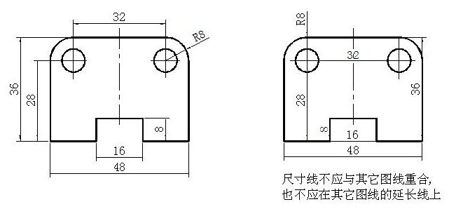 2、尺寸线:表示所注尺寸的范围,用细实线绘制。尺寸线不能用其它图线代替,不得与其它图线重合或画在其延长线上,并应尽量避免尺寸线之间及尺寸线与尺寸界线相交。标注线性尺寸时,尺寸线必须与所标注的线段平行,相互平行的尺寸线小尺寸在内,大尺寸在外,依次排列整齐。并且各尺寸线的间距要均匀,间隔应大于5mm ,以便注写尺寸数字和有关符号。