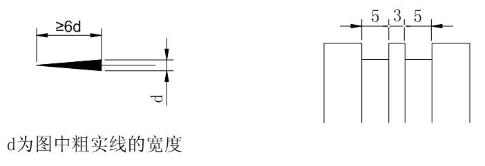 3、尺寸线终端 尺寸线终端有两种形式:箭头和细斜线。机械图样一般用箭头型式,箭头尖端与尺寸界线接触,不得超出也不得离开,如下图所示。 当尺寸线太短,没有足够的位置画箭头时,允许将箭头画在尺寸线外边;标注连续的小尺寸时可用圆点代替箭头。