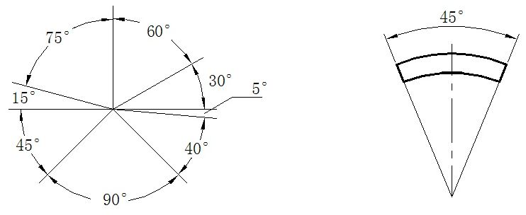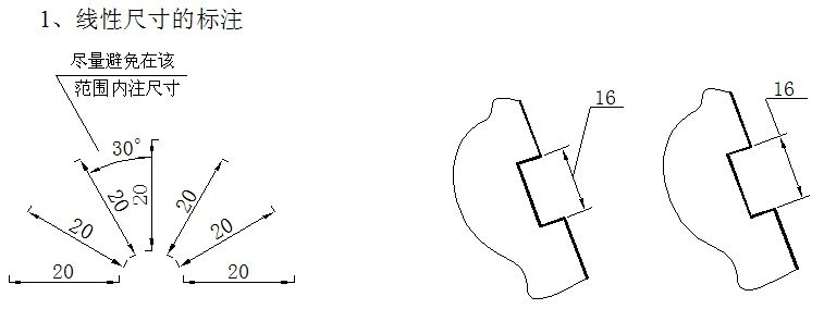 2、角度尺寸的标注:角度的尺寸界线应沿径向引出,尺寸线是以角的顶点为圆心画出的圆弧线。角度的数字应水平书写,一般注写在尺寸线的中断处,必要时也可写在尺寸线的上方或外侧。角度较小时也可以用指引线引出标注。角度尺寸必须注出单位.