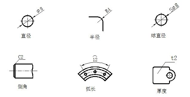 3、圆和圆弧尺寸 圆及圆弧的尺寸,可将轮廓线作为尺寸界线,尺寸线或其延长线要通过圆心。大于半圆的圆弧标注直径,在尺寸数字前加注符号“Ф”,小于和等于半圆的圆弧标注半径,在尺寸数字前加注符号“R” 。