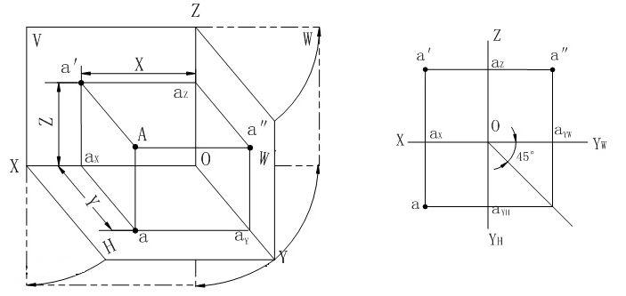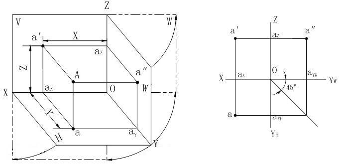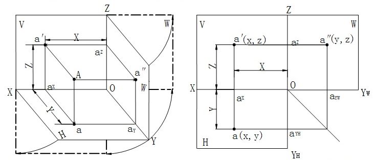 ★2.3.1 点的投影及其标记 当投影面和投影方向确定时,空间一点只有唯一的一个投影。假设空间有一点A,过点A分别向H面、V面和W面作垂线,得到三个垂足a、a′、a″,便是点A在三个投影面上的投影
