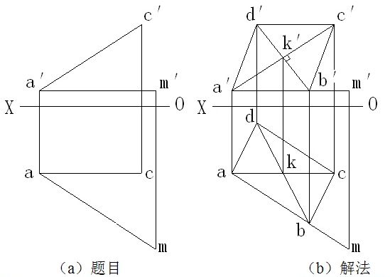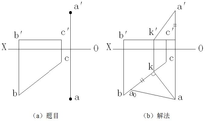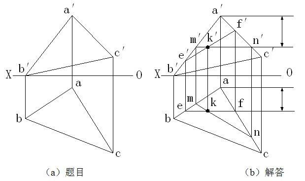 例2-11 △ABC平面如图(a)所示,要求在△ABC平面上取一点K ,使K点在A点之下15mm ,在A点之前10mm ,试求出K点的两面投影。