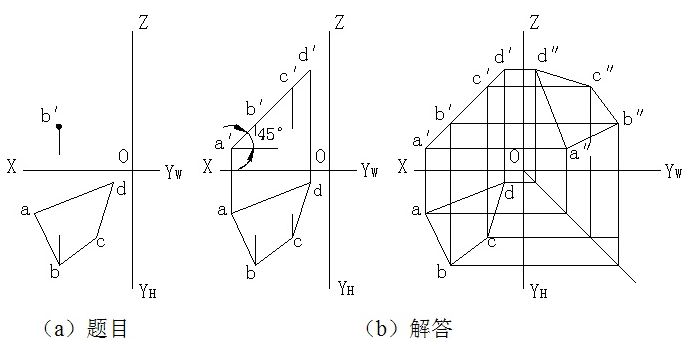例题2-9 如图,四边形ABCD垂直于V面,已知H面的投影abcd及B点的V面投影b′,且于H面的倾角α= 45°,求作该平面的V面和W面投影。
