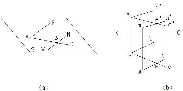 例2-9:如图,相交两直线AB、AC确定一平面P,在直线AC上取点E,过点E作直线MN∥AB,则直线MN为平面P上的直线。