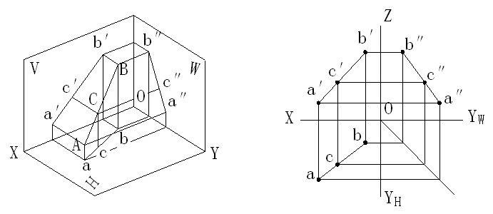 ★2.4.5 直线上点的投影 ★2.4.5.1直线上点的投影 点在直线上,则点的各个投影必定在该直线的同面投影上,反之,若一个点的各个投影都在直线的同面投影上,则该点必定在直线上。