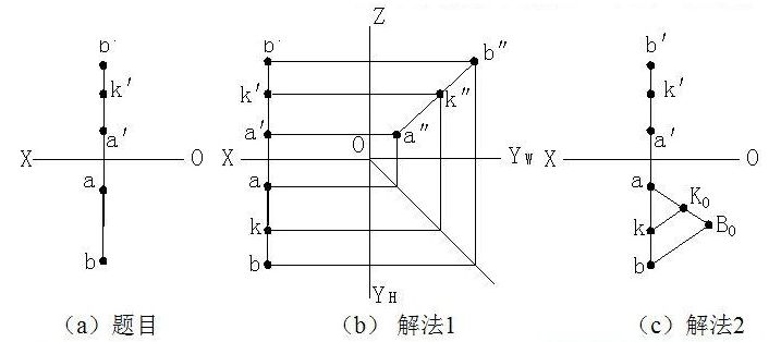 ★2.4.5.2直线投影的定比性 点C在线段AB上,它把线段AB分成AC和CB两段。根据直线投影的定比性,AC:CB = ac:cb = a′ c′:c′ b′ = a″c″:c″b″ 。 例题2-6 如图,已知侧平线AB的两投影和直线上K点的正面投影k′,求K点的水平投影k 。 ![]()