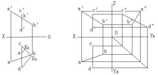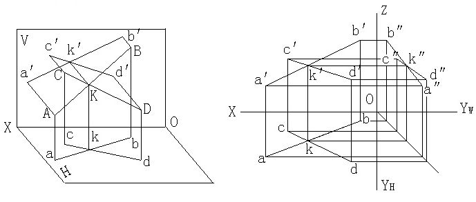 ★2.4.6.2两直线相交 1、特性:若空间两直线相交,则它们的各同面投影必定相交,且交点符合点的投影规律。如图两直线AB、CD相交于K点,因为K点是两直线的共有点,则此两直线的各组同面投影的交点 k、 k′、k″ 必定是空间交点K的投影。