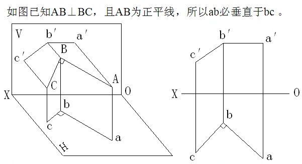概念:空间垂直相交的两直线,若其中的一直线平行于某投影面时,则在该投影面的投影仍为直角。反之,若相交两直线在某投影面上的投影为直角,且其中有一直线平行于该投影面时,则该两直线在空间必互相垂直。这就是直角投影定理。