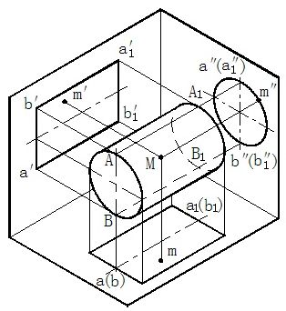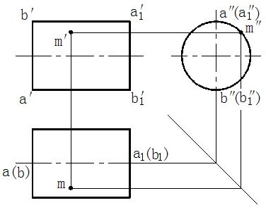 画圆柱的投影时,为便于作图,一般常使它的轴线垂直于某个投影面。如图3-4(a)所示,圆柱的轴线垂直于侧面,圆柱面上所有素线都是侧垂线,因此圆柱面的侧面投影积聚成为一个圆。圆柱左、右两个底面的侧面投影反映实形并与该圆重合。两条相互垂直的点划线,表示确定圆心的对称中心线。圆柱面的正面投影是一个矩形,是圆柱面前半部与后半部的重合投影。