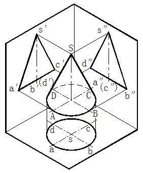 (3)根据圆锥的高度定出锥顶S的投影位置,然后根据投影规律,作出正面投影和水平投影。