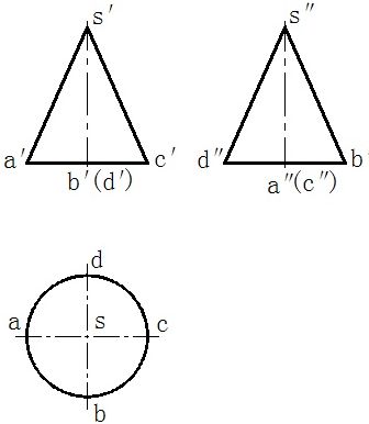 从图3-4(b)可以看出圆锥的投影特征:当圆锥的轴线垂直某一个投影面时,则圆锥在该投影面上投影为与其底面全等的圆形,另外两个投影为全等的等腰三角形。