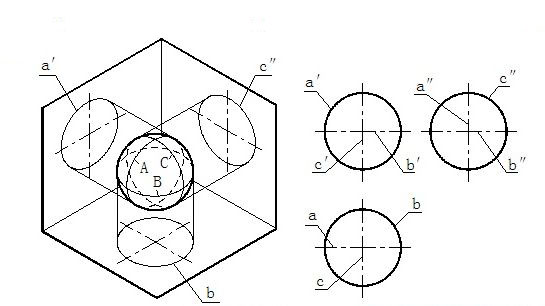 如图3-8(b)所示为圆球的立体图、如图3-8(c)所示为圆球的投影。圆球在三个投影面上的投影都是直径相等的圆,但这三个圆分别表示三个不同方向的圆球面轮廓素线的投影。正面投影的圆是平行于V面的圆素线A(它是前面可见半球与后面不可见半球的分界线)的投影。与此类似,侧面投影的圆是平行于W面的圆素线C的投影;水平投影的圆是平行于H面的圆素线B的投影。这三条圆素线的其他两面投影,都与相应圆的中心线重合,不应画出。