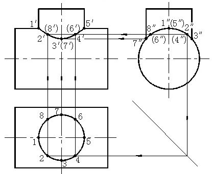 2.求一般点。在相贯线的水平投影圆上的特殊点之间适当地定出若干一般点的水平投影,如图中2、4、6、8等点,再按投影关系作出它们的侧面投影2″、(4″)、(6″)、8″。然后根据水平投影和侧面投影可求出正面投影2′、4′、(6′)、(8′)。