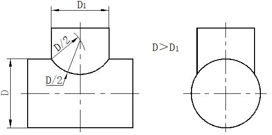 相贯线的作图步骤较多,如对相贯线的准确性无特殊要求,当两圆柱垂直正交且直径有相差时,可采用圆弧代替相贯线的近似画法。如图3-22所示,垂直正交两圆柱的相贯线可用大圆柱的D/2为半径作圆弧来代替。
