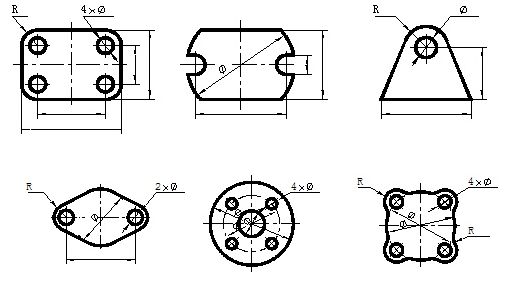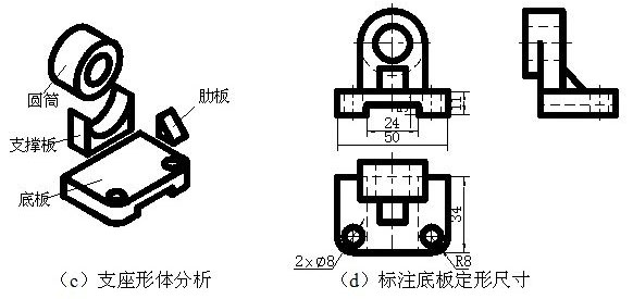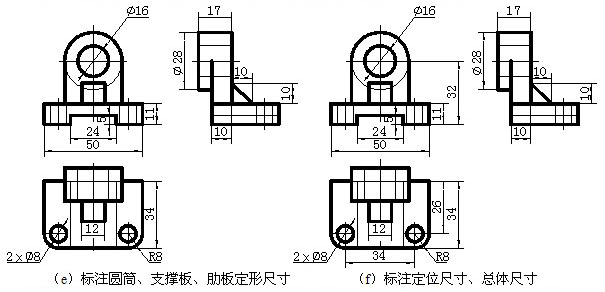 (3)根据形体分析,逐个注出底板、圆筒、支撑板、肋板的定形尺寸。如图(d)、(e)所示。