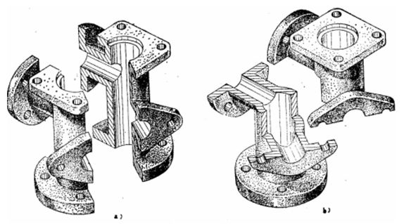 剖视图——主要用于表达机件的内部形状。包括全剖视图、半剖视图、 局部剖视图、阶梯剖视图、旋转剖视图、斜剖视图、组合剖视图。