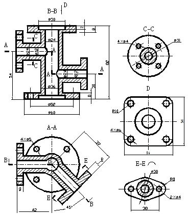 (“D”向)、一个局部剖视 图(“C—C”)和一个斜剖的