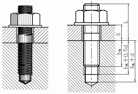 双头螺柱的两头制有螺纹,一端旋入被连接件的预制螺孔中,称为旋入端;另一端与螺母旋合,紧固另一个被连接件,称为紧固端。