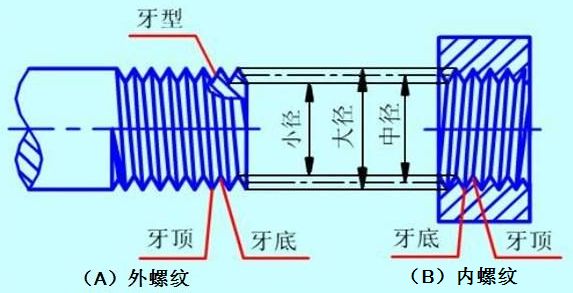 ★8.3.1 螺纹基本知识 螺纹是在圆柱(或圆锥)表面上的沿螺旋线有规定牙型的连续凸起(又称为牙)。 外螺纹: 在圆柱(或圆锥)外表面上的螺纹。 内螺纹: 在圆柱(或圆锥)内表面上的螺纹。