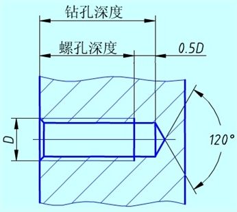 不穿通的螺纹孔的画法 画不穿通的螺纹孔时,一般应将钻孔深度与螺孔深度分别画出,两个深度相差0.5D(其中D为螺纹孔公称直径),钻孔尖端锥角应按120°画出。