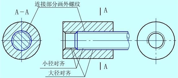 螺纹副的画法 当内外螺纹连接构成螺纹副时,其旋合部分应按外螺纹的画法绘制,其余部分仍按各自的画法表示。